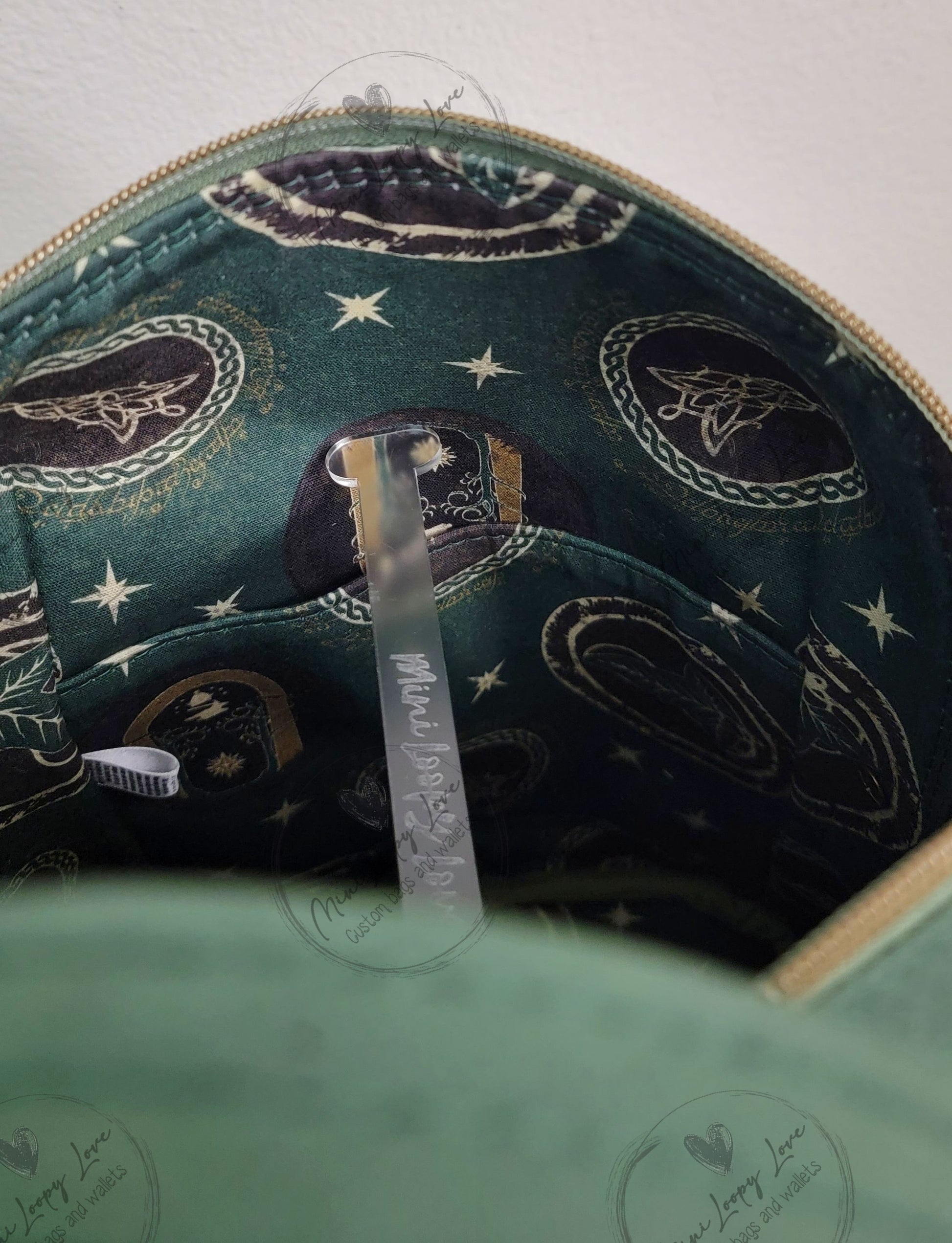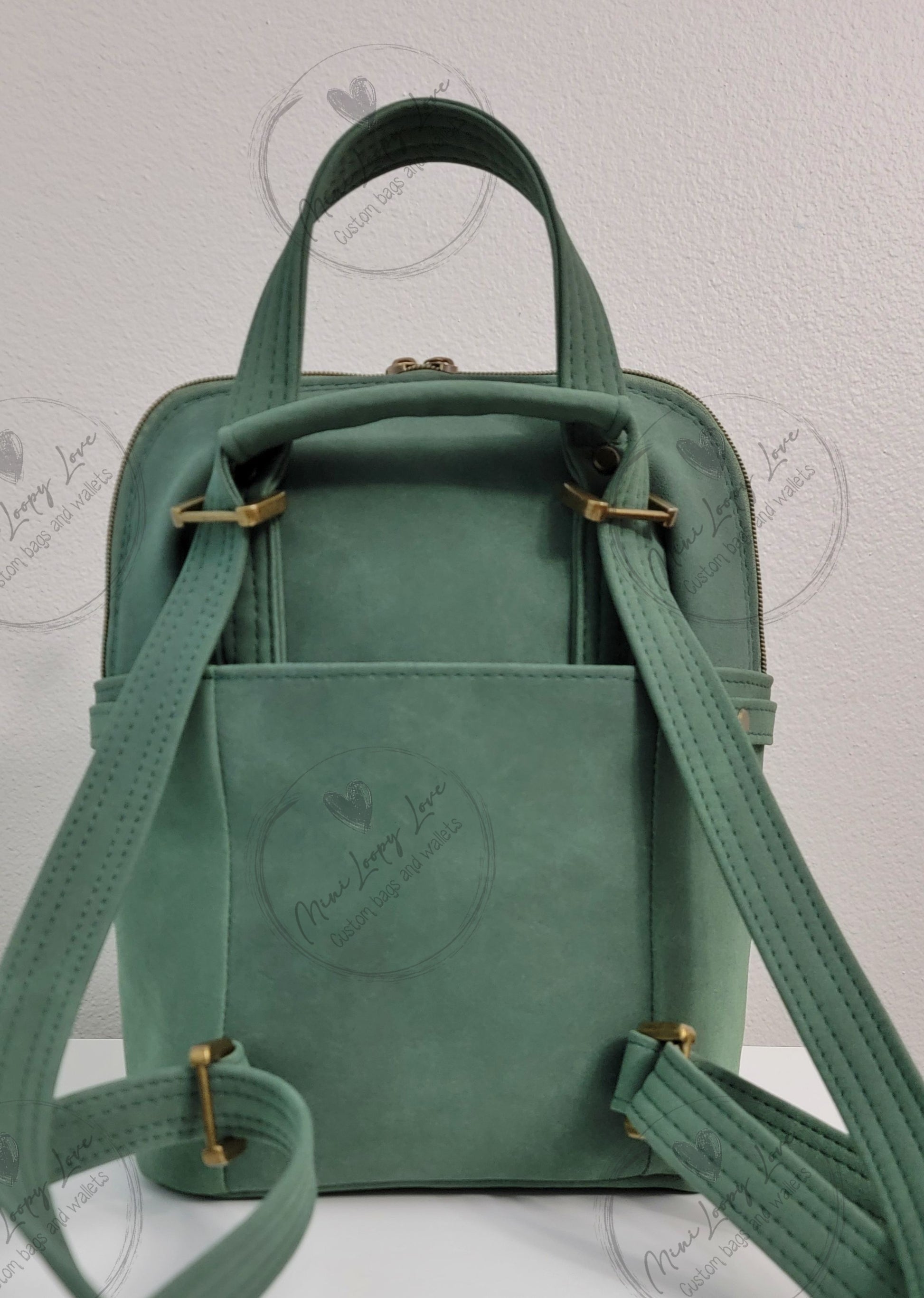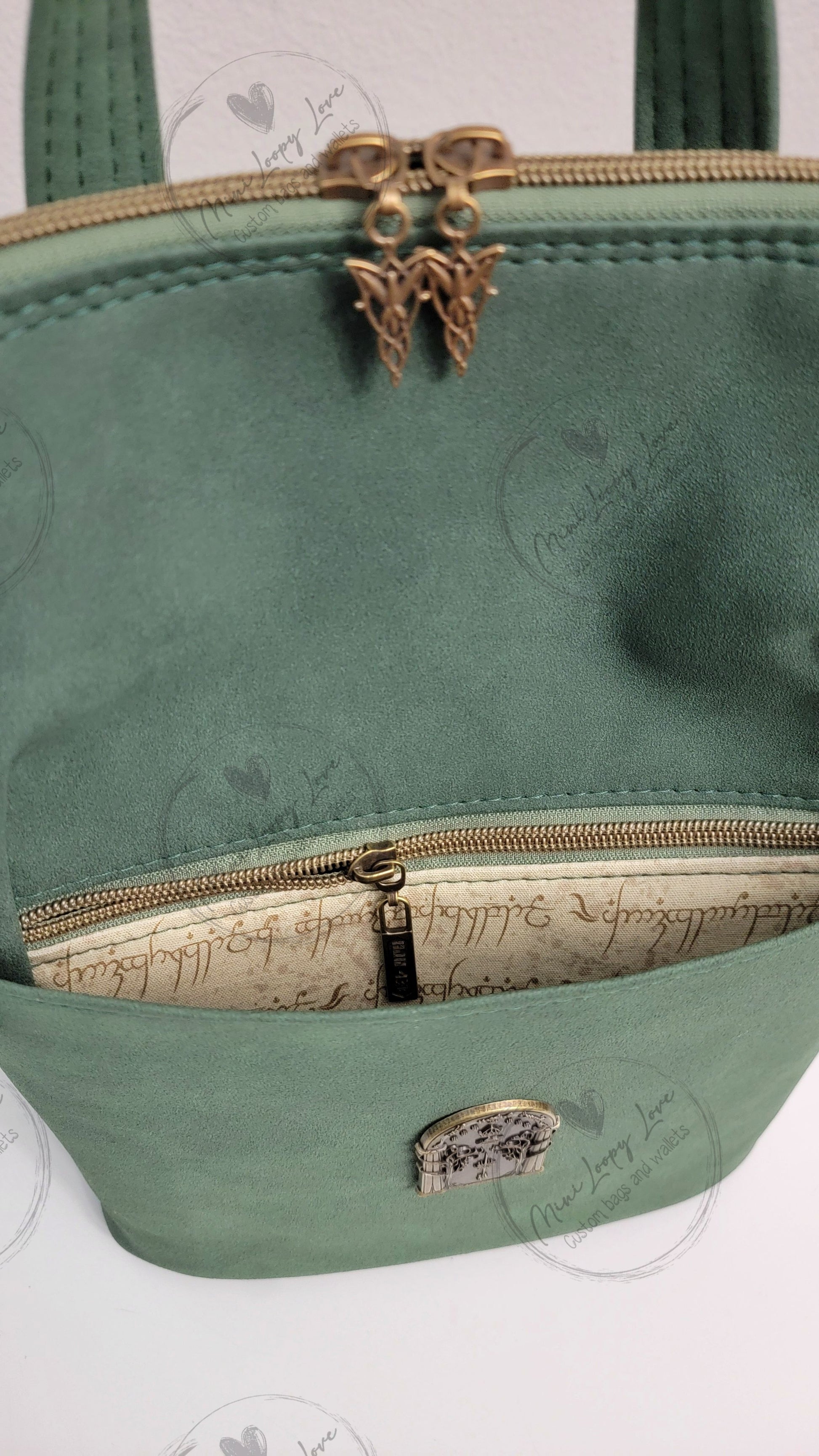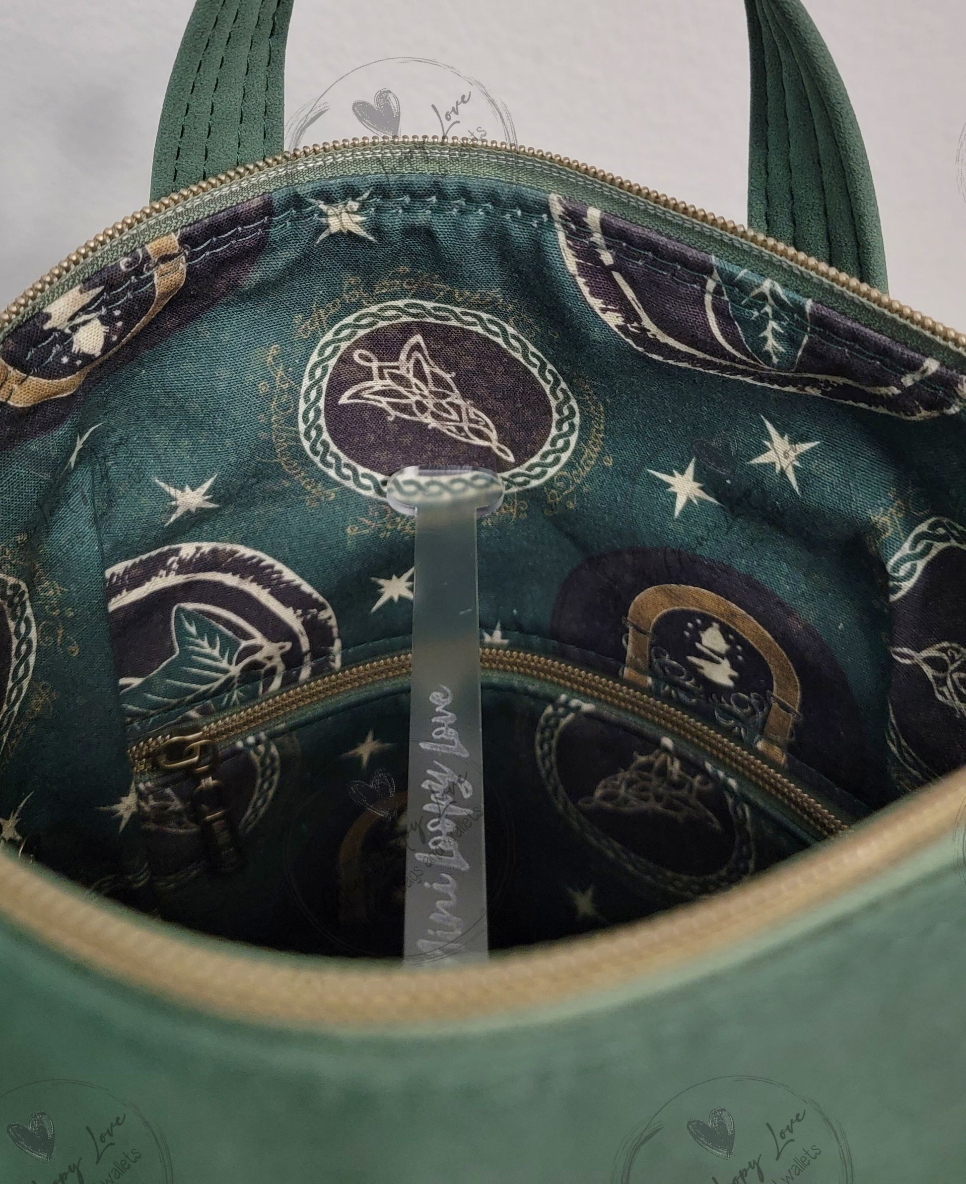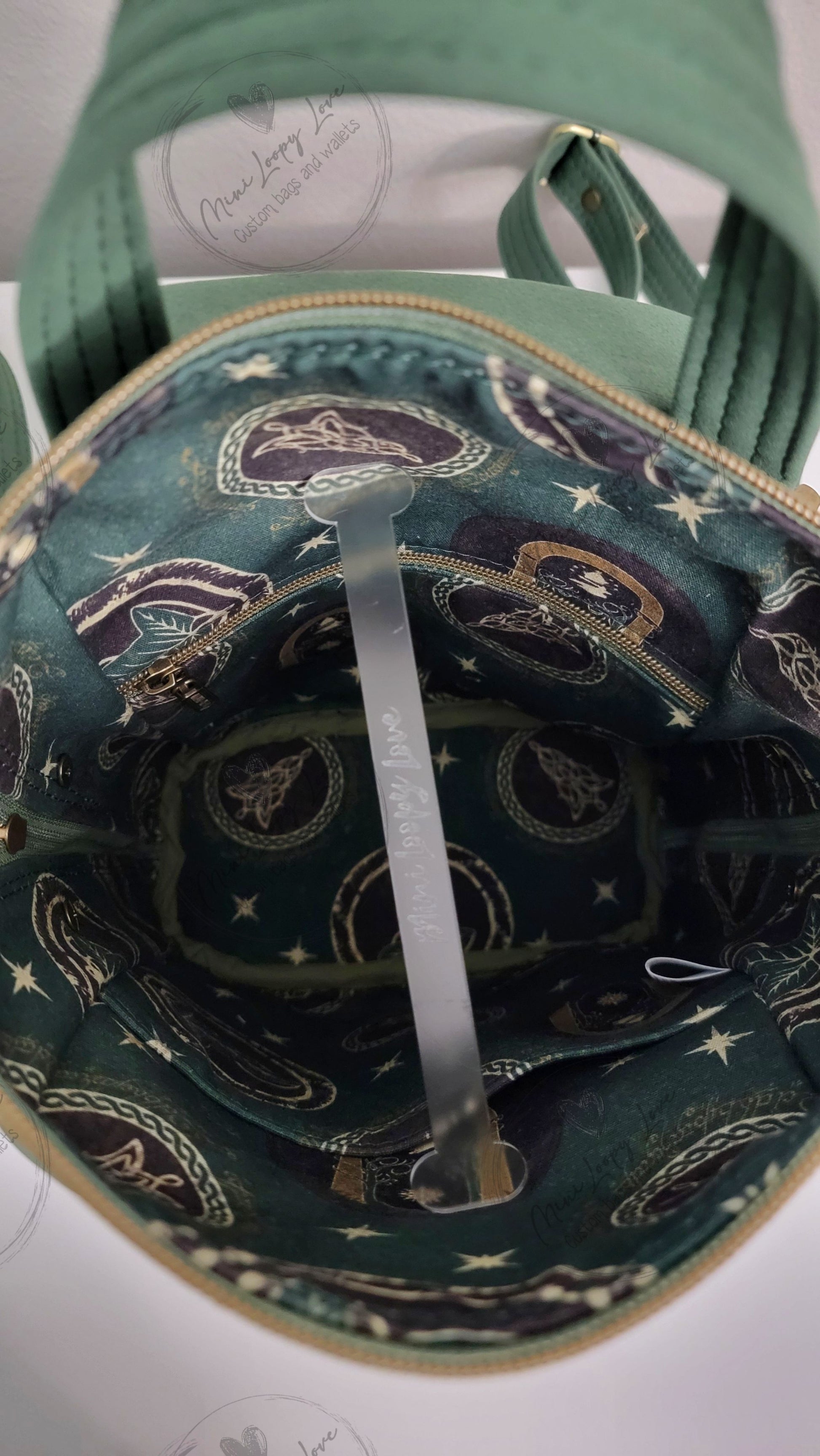 This baby converts to a crossbody bag by just pulling that handle cover area up! There is a hidden zipper pocket behind the front and back slip pockets. Inside is another zipper pocket and slip pocket. It's about 10" W x 11.5” H x 5" D