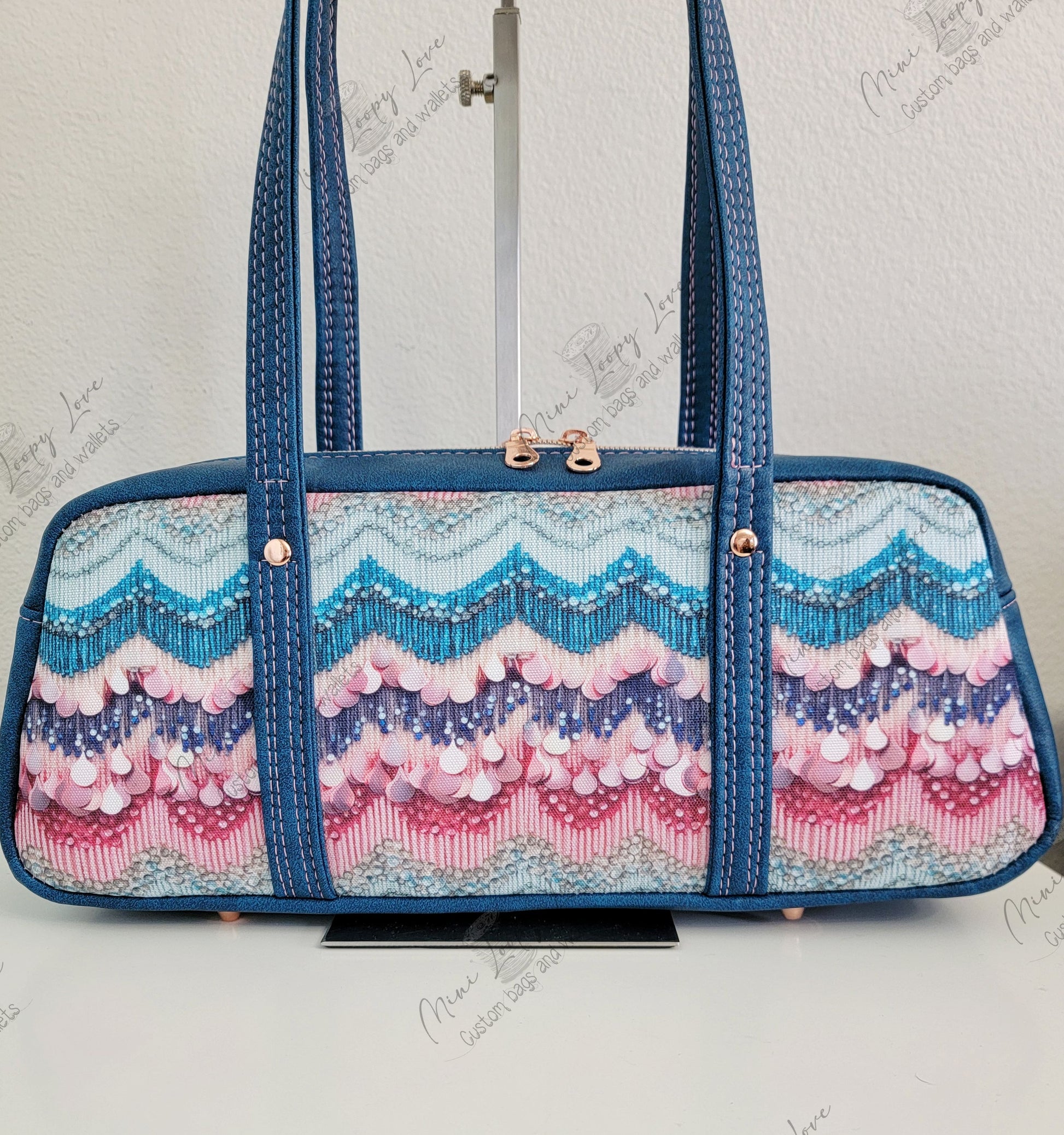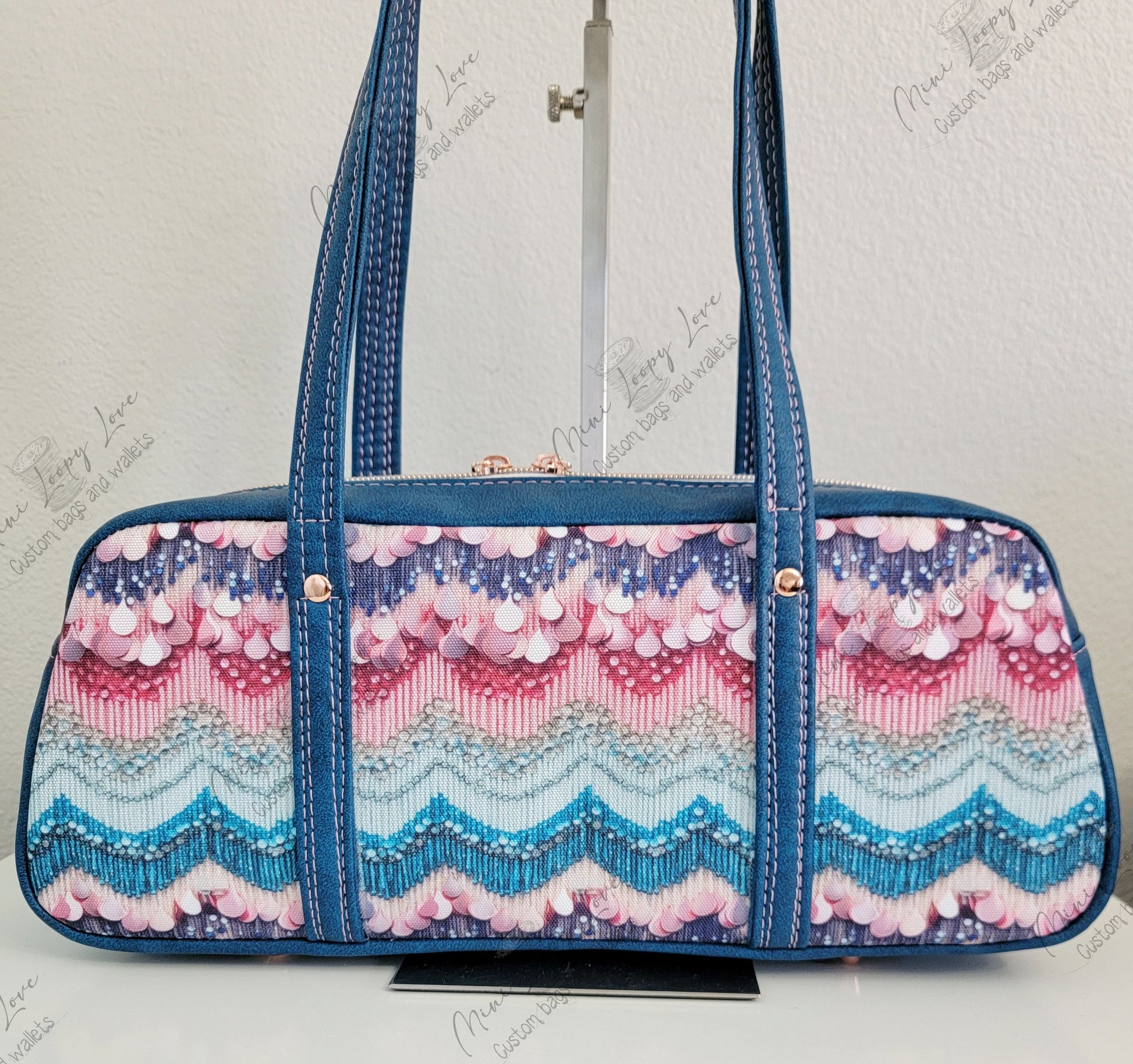 Constructed in custom Tay's Dress inspired waterproof canvas (there are no sequins in this. It is printed to look like it) and accented in Teal Mora Faux leather. Inside is lined in blue waterproof canvas and star canvas. There is rose gold hardware accented throughout.