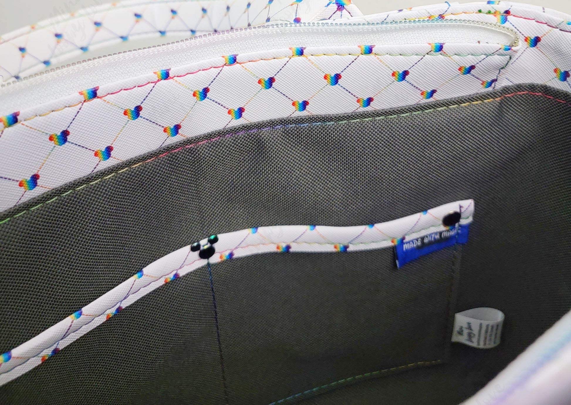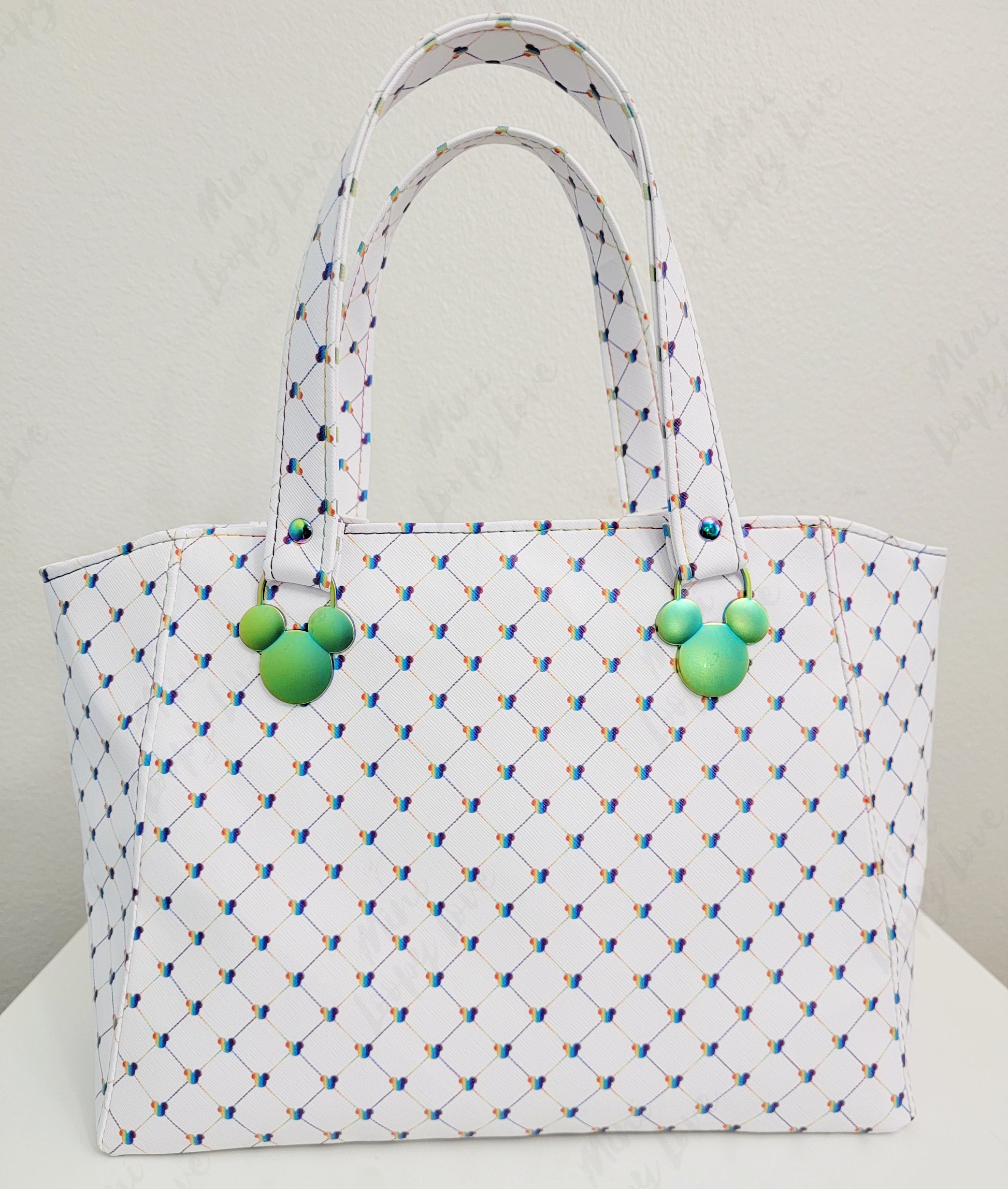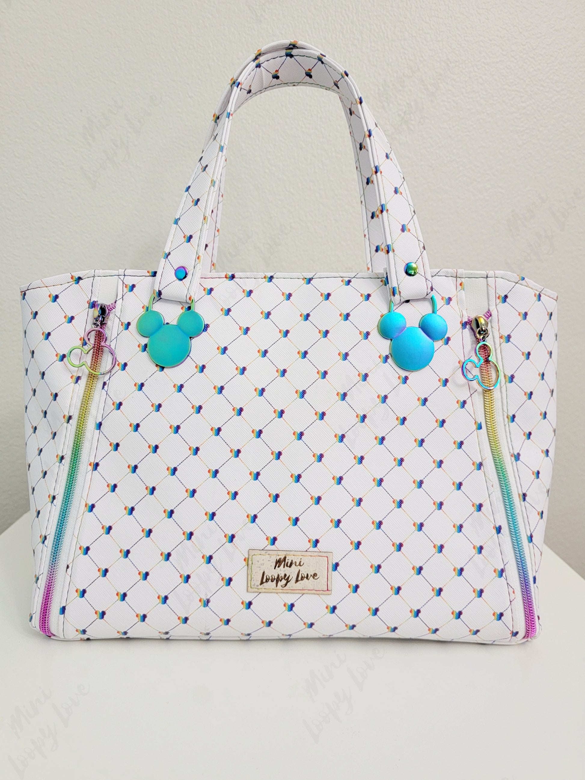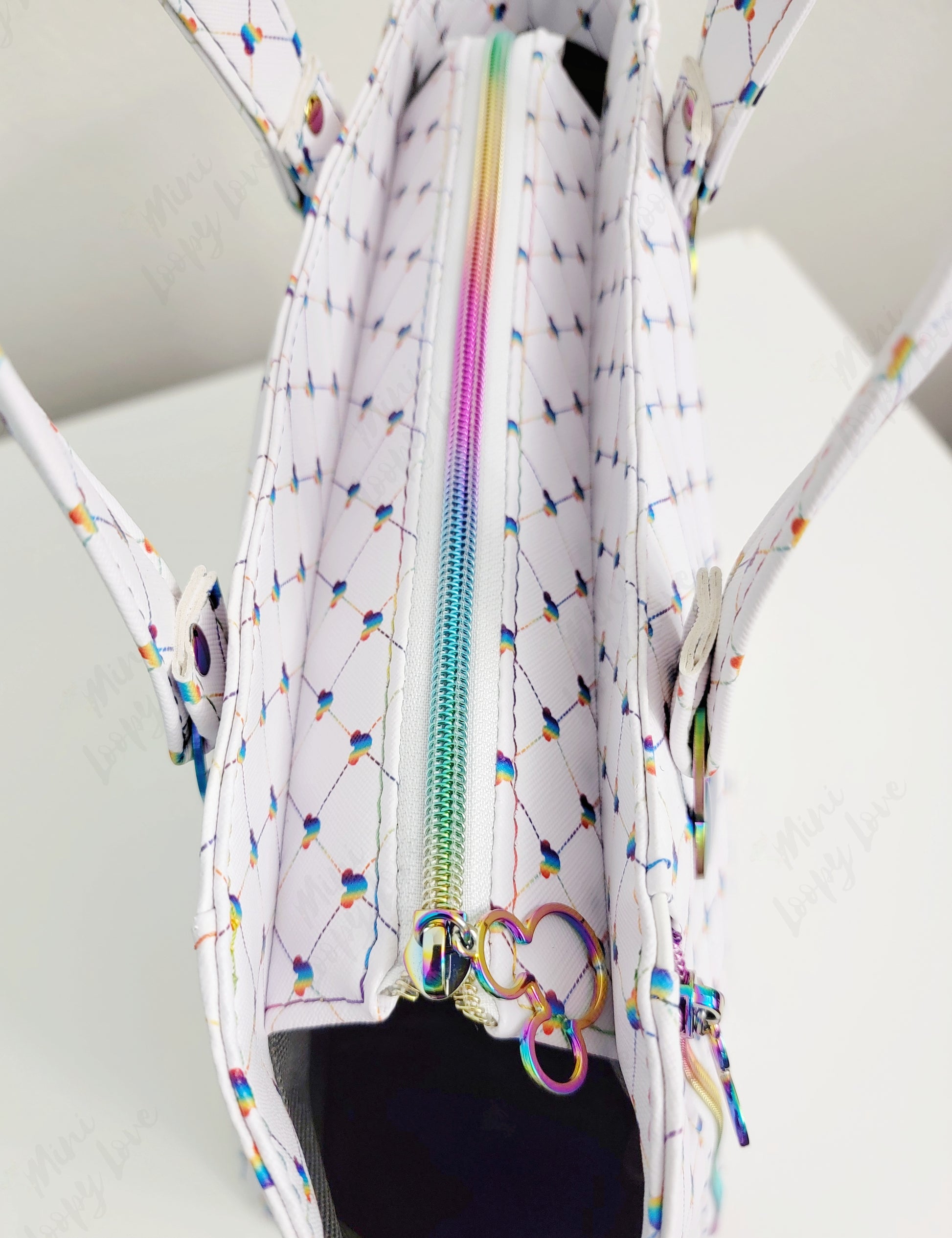 You're about to be the envy of everyone at the party—the Rudeneja Handbag from Miniloopylove is one of a kind. Crafted with a quilted rainbow mouse head vinyl, this bag features rainbow mouse head strap connectors, purse feet and bright rainbow stitching. Plus, it's made with a splash of magic! Inside you'll find a gray waterproof canvas lining and enough room to fit all your essentials. Finally, with its detachable crossbody strap, you can confidently carry this bag around in style and comfort.