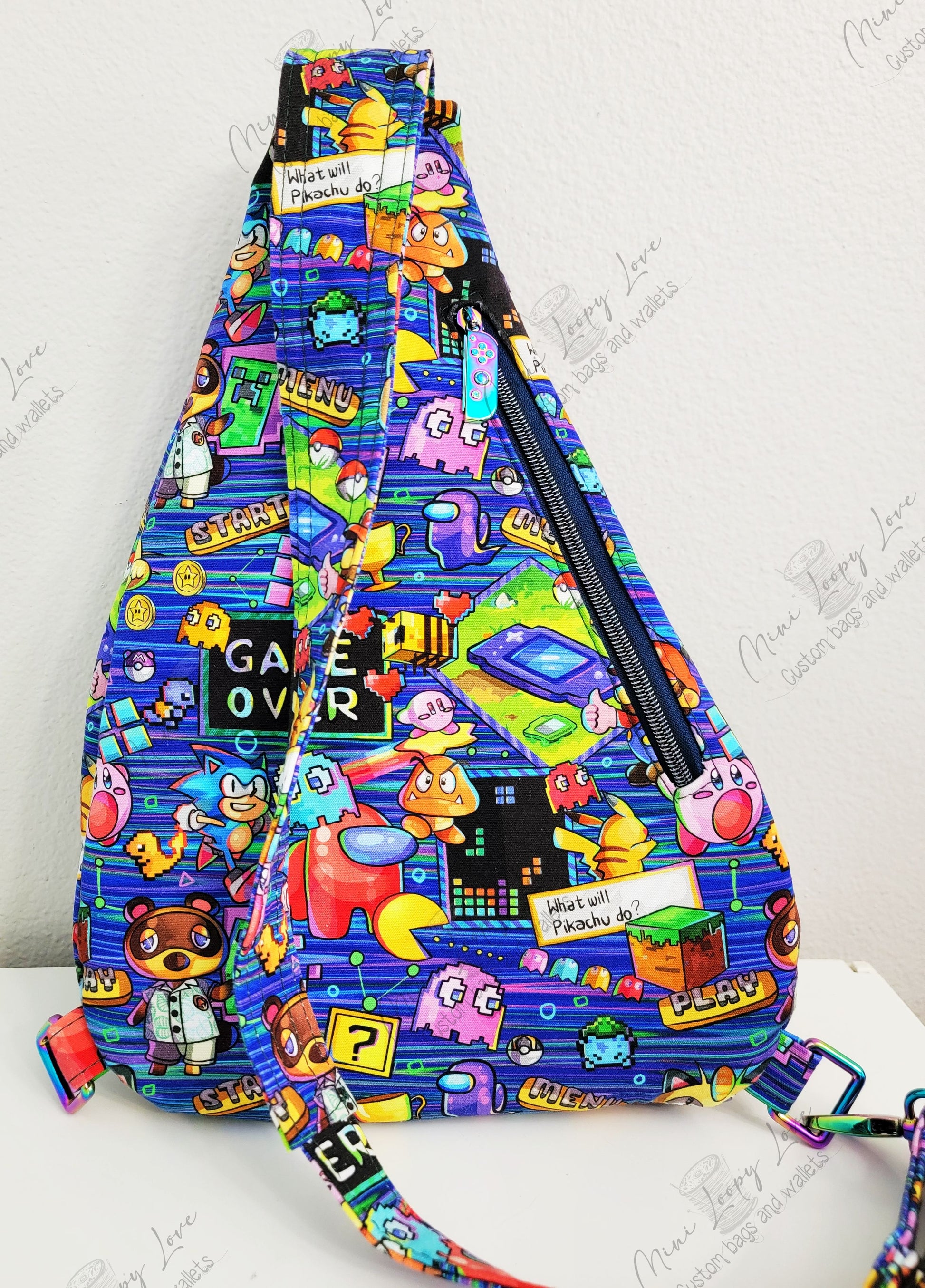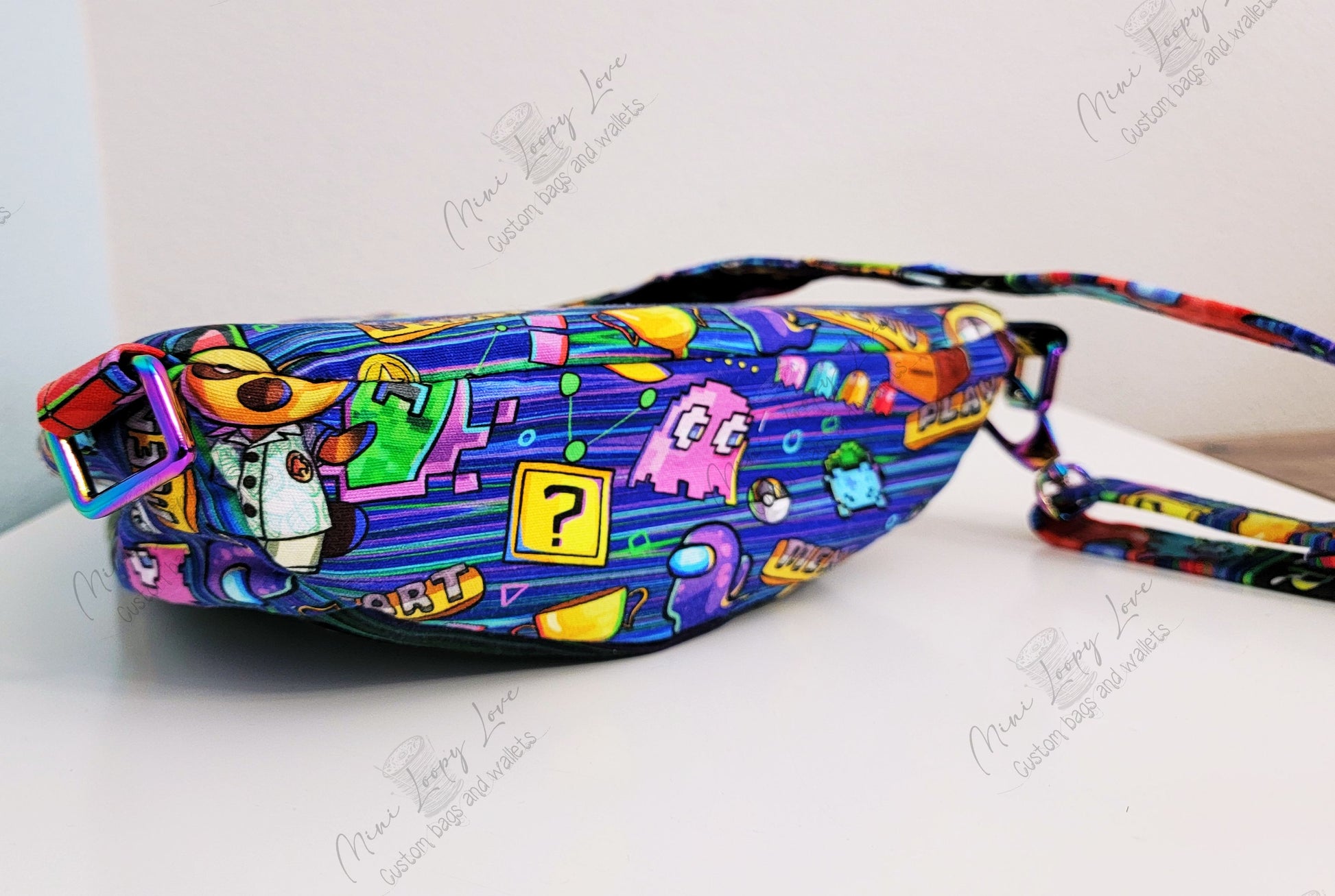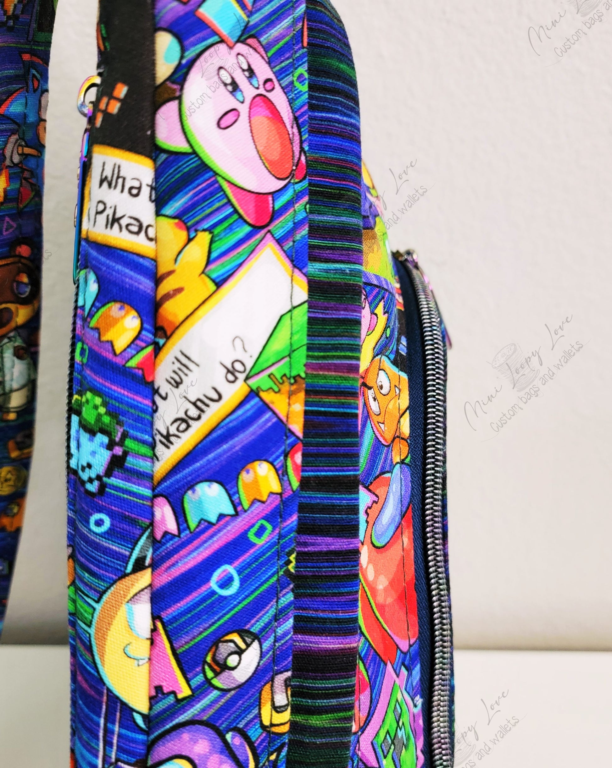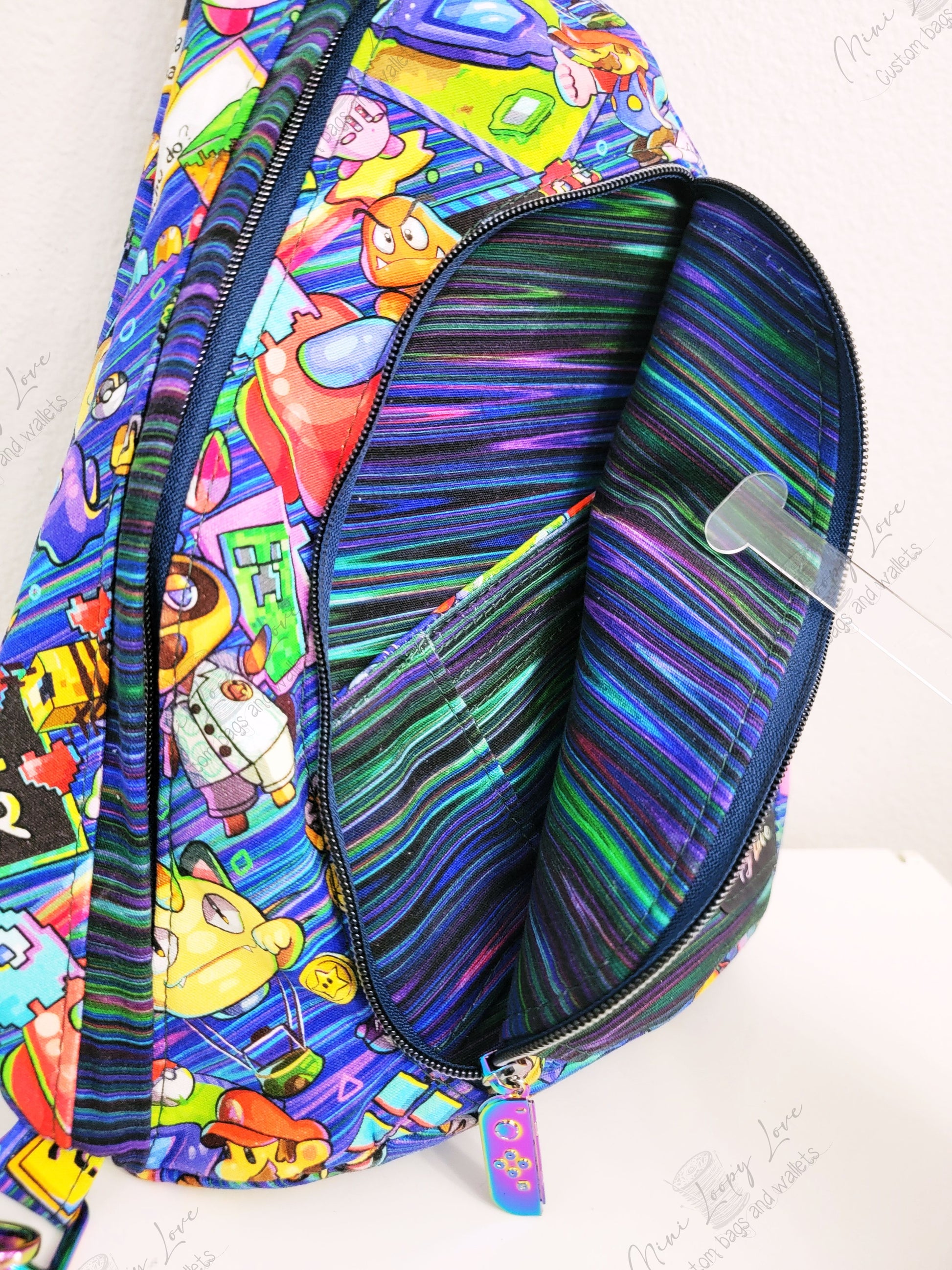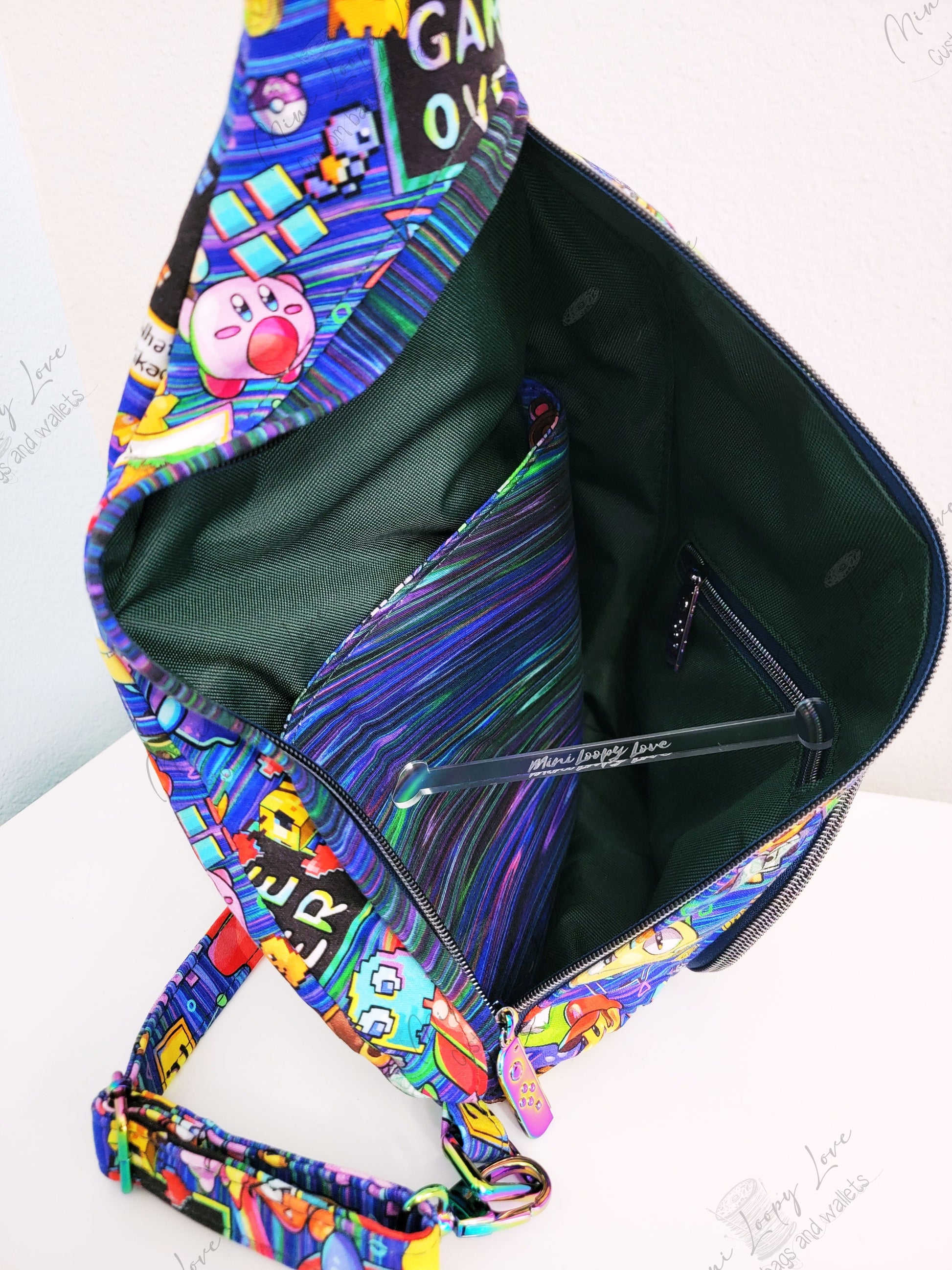 This Summit is crafted in custom Gamer cotton canvas fabric. There are rainbow hardware accents throughout. Additionally the bag is lined in green waterproof canvas with custom cotton canvas accents.