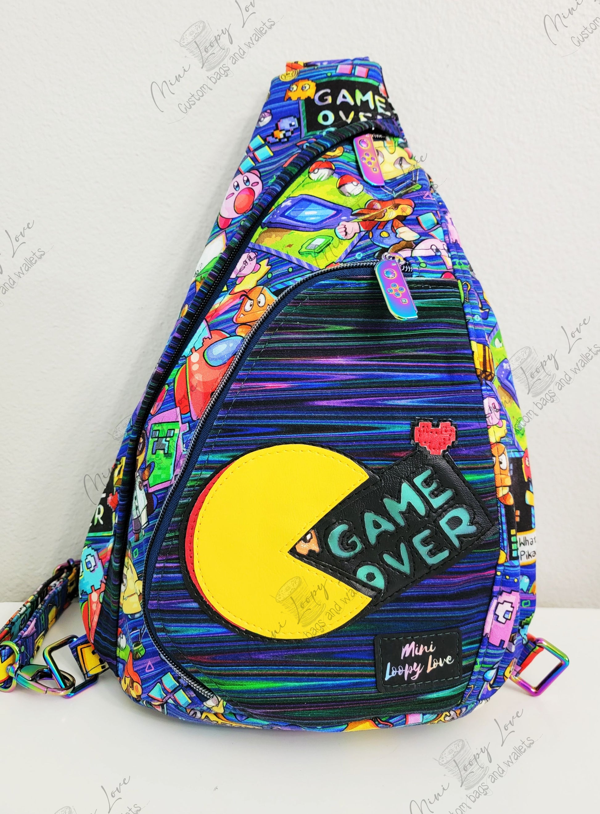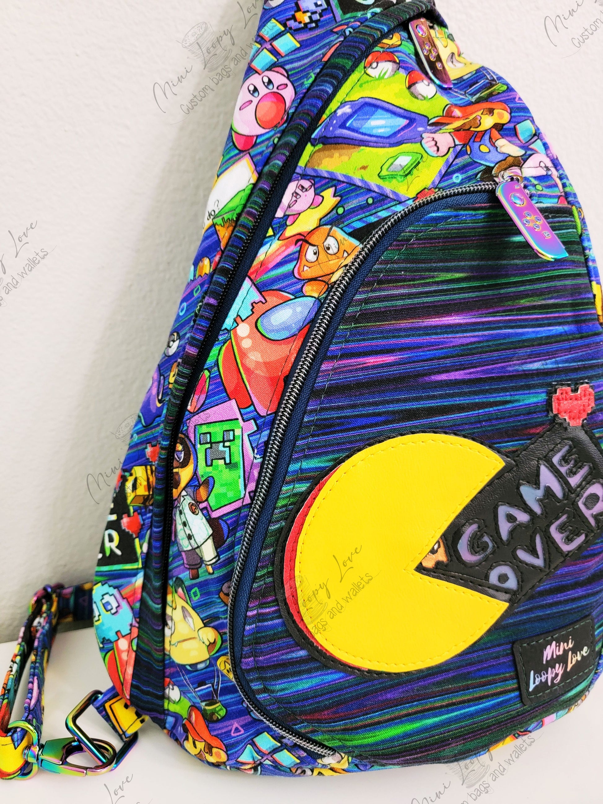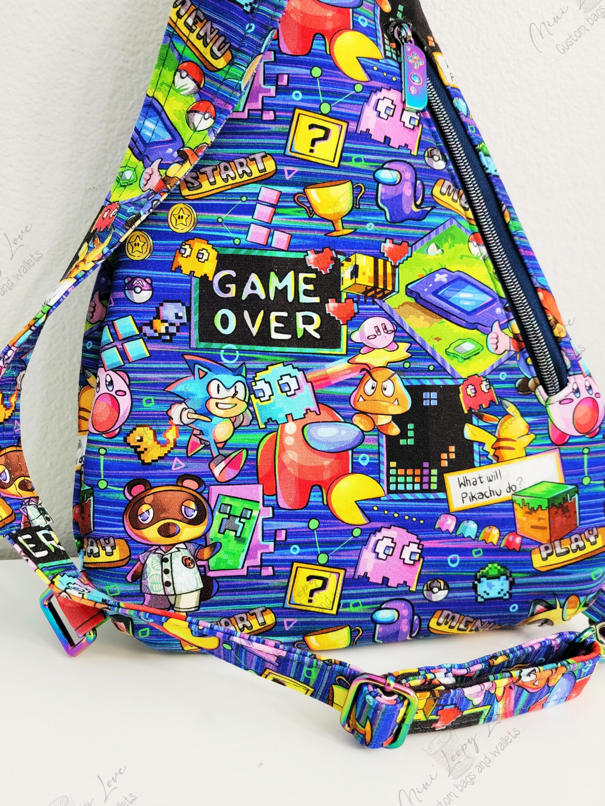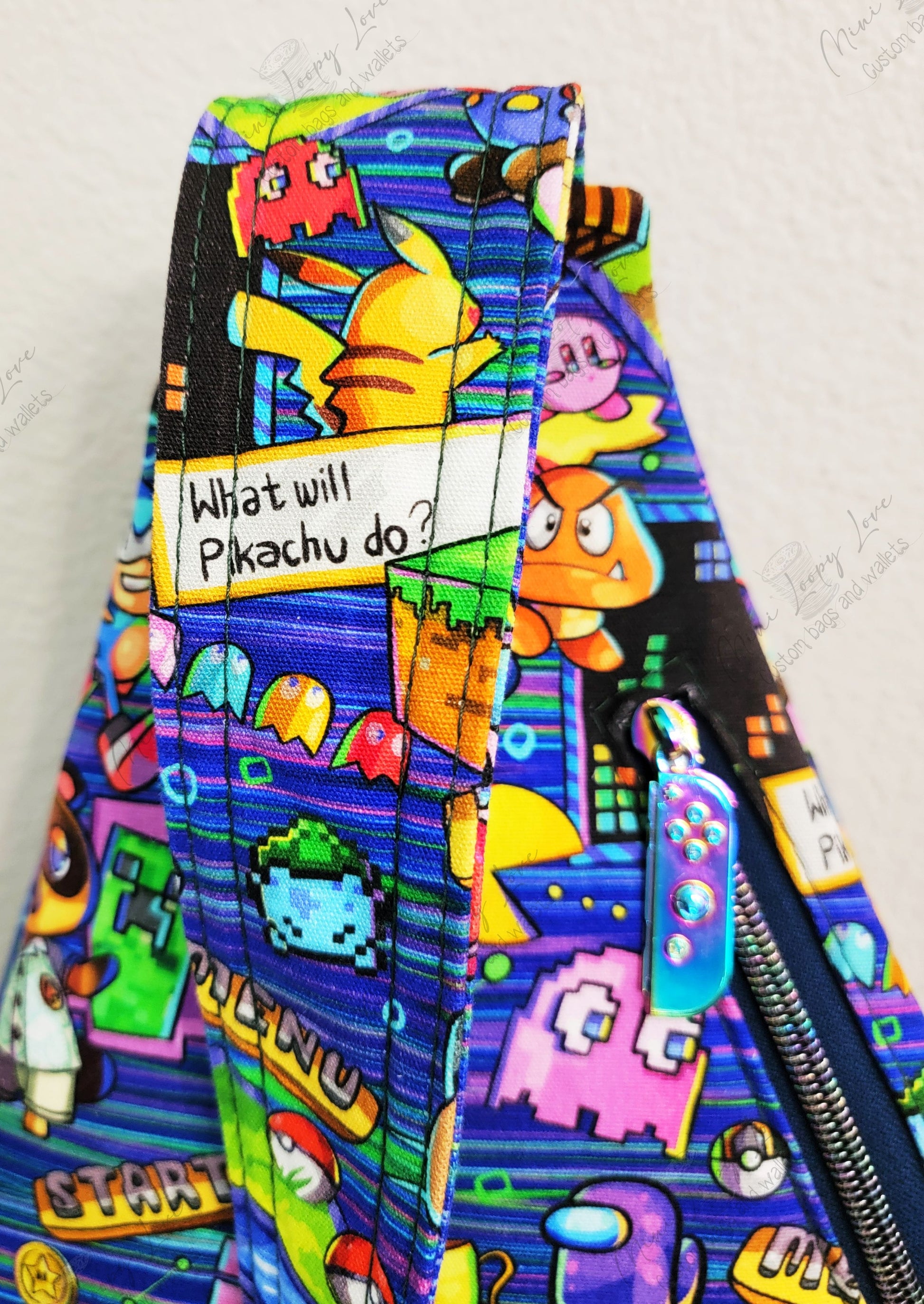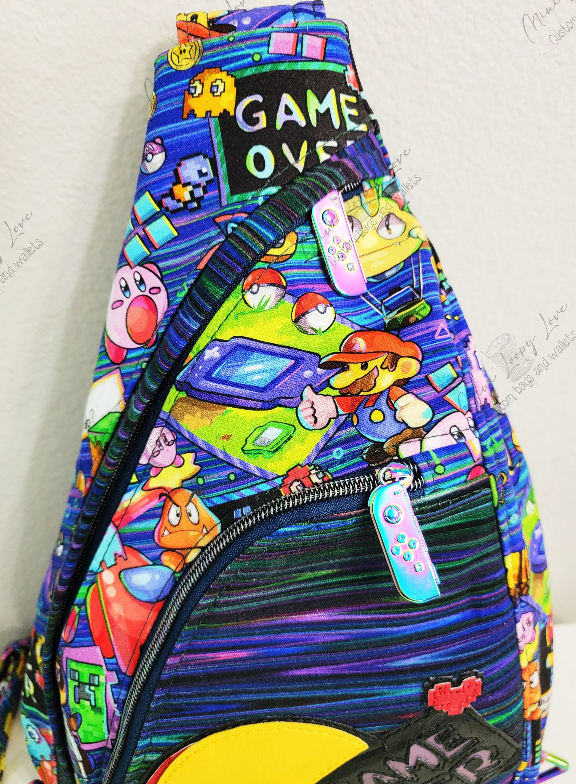 This Summit is crafted in custom Gamer cotton canvas fabric. There are rainbow hardware accents throughout. Additionally the bag is lined in green waterproof canvas with custom cotton canvas accents.