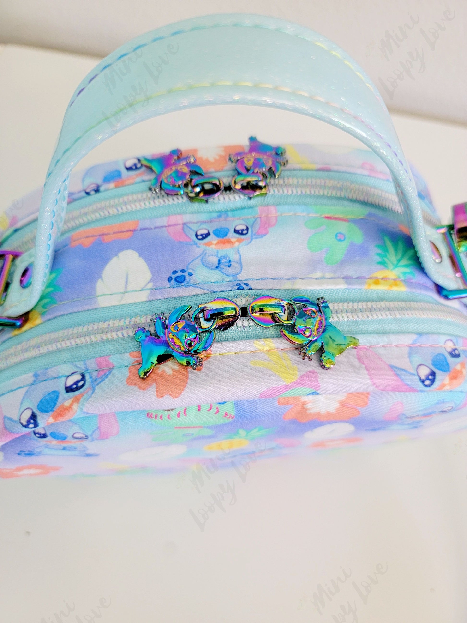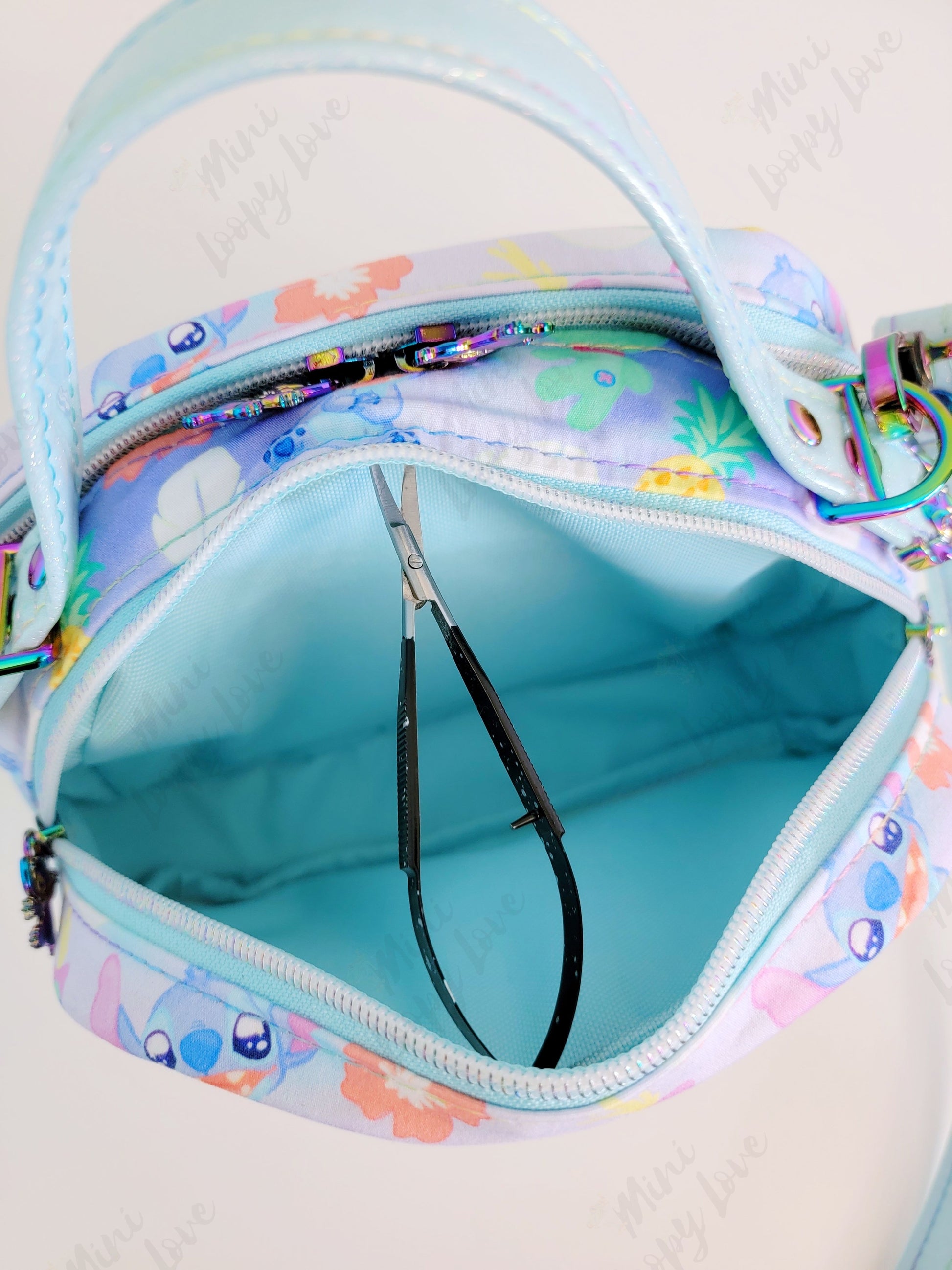 Constructed in custom woven fabric with blue (sealed) glitter vinyl exterior.