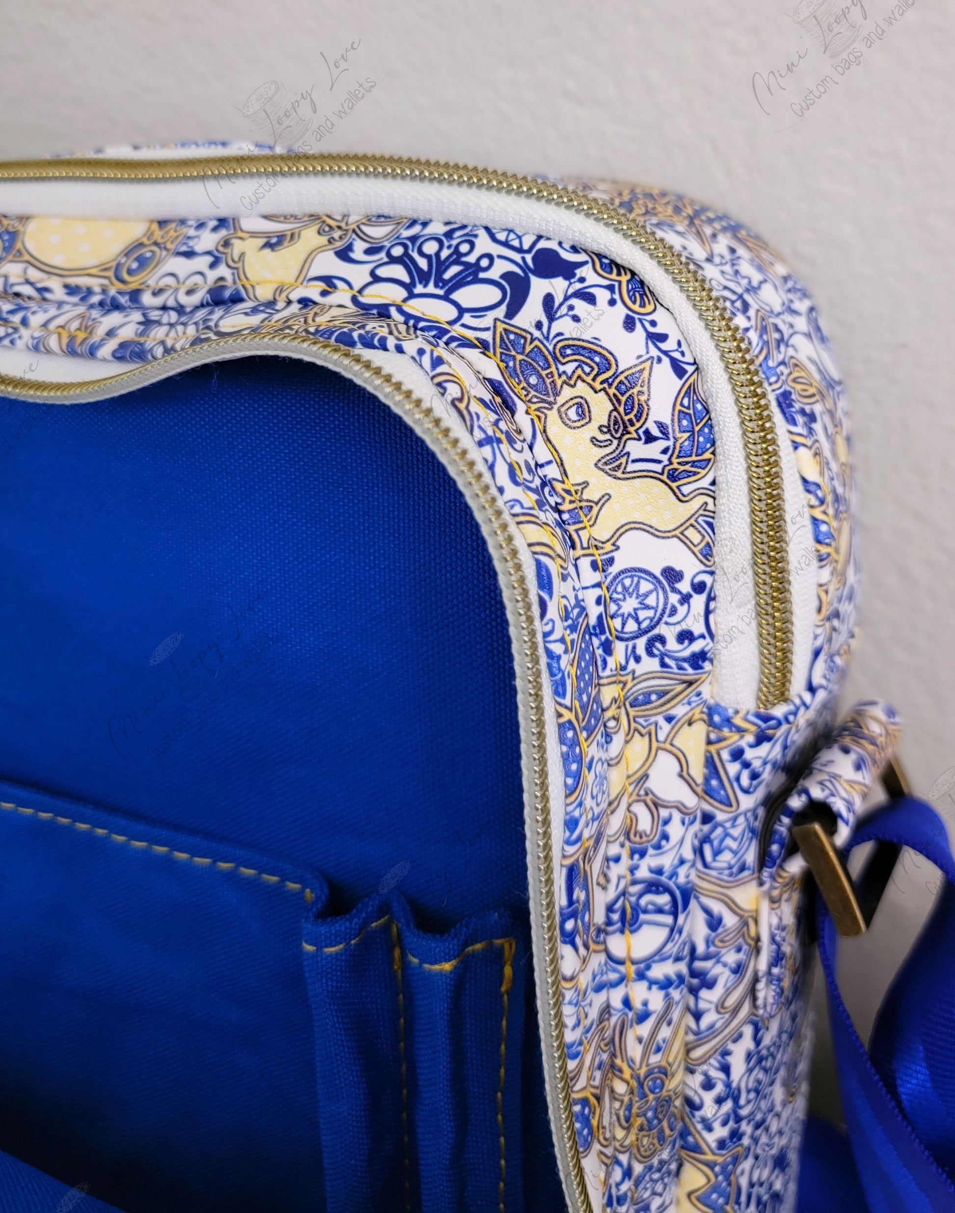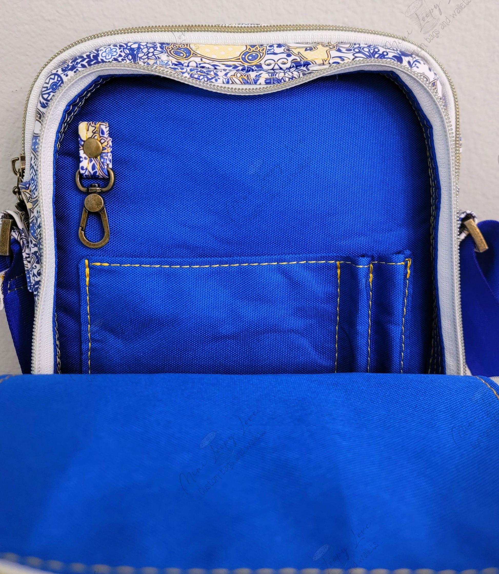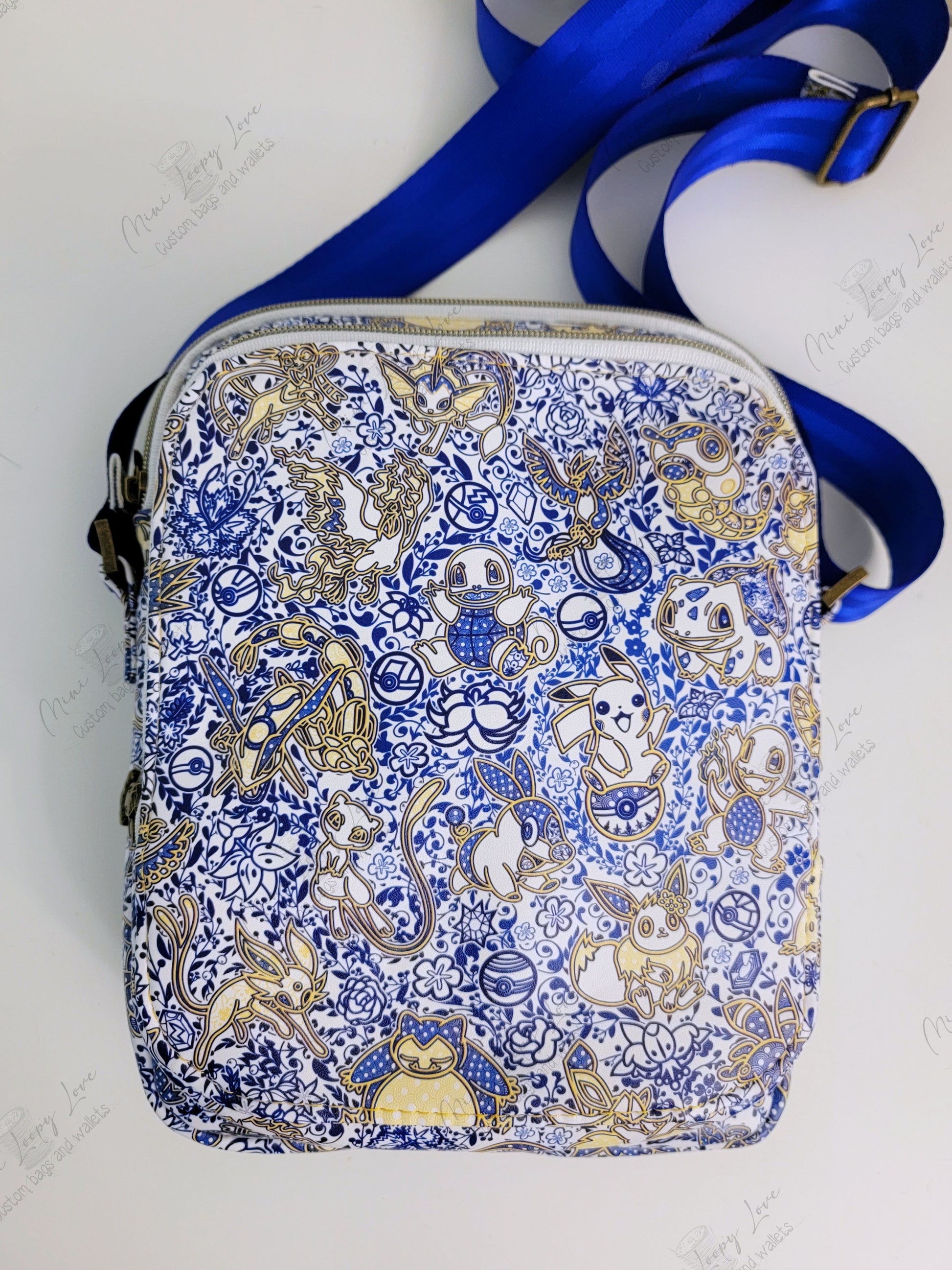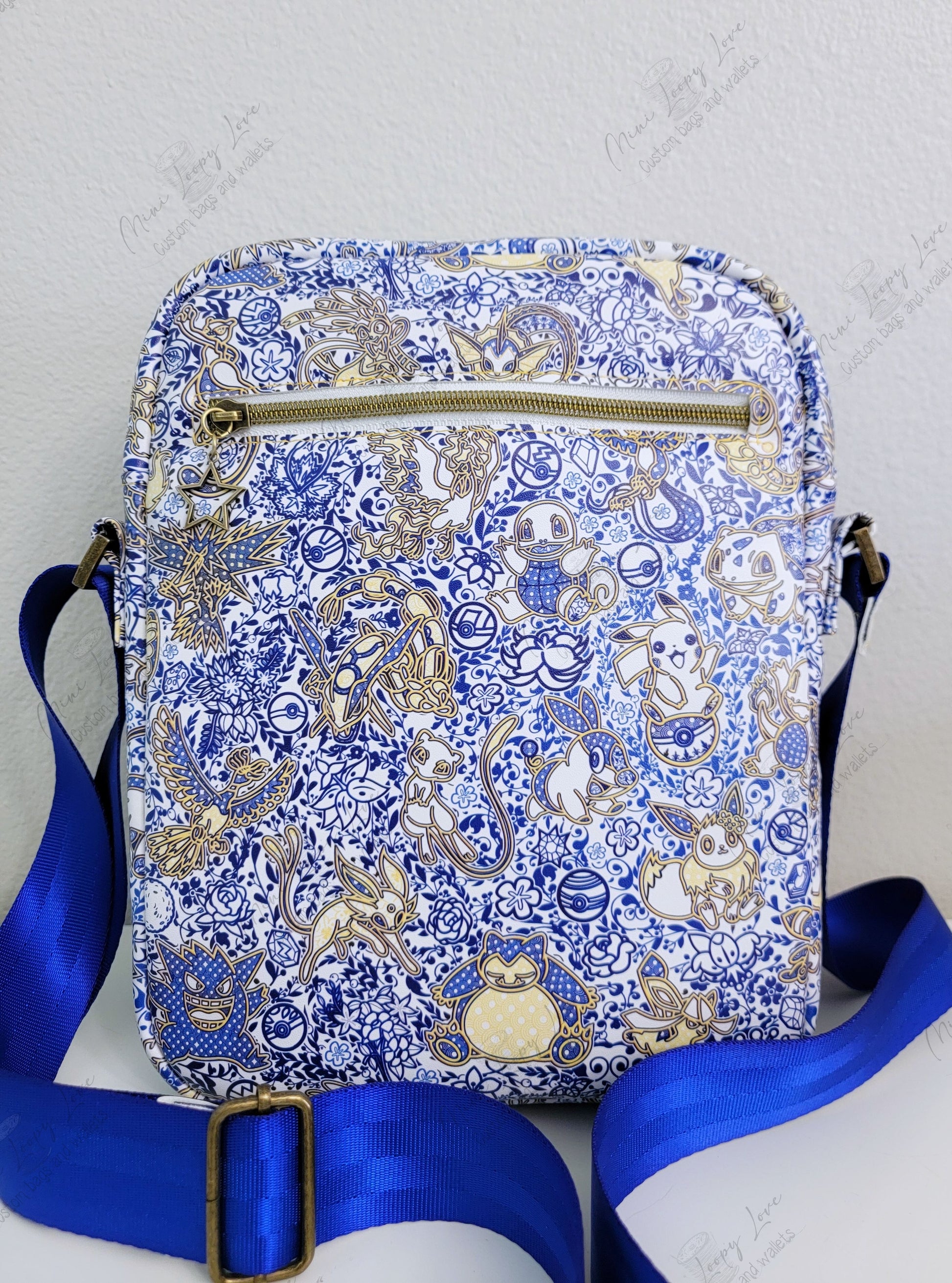 - 1.5" adjustable crossbody strap in blue seatbelt webbing for maximum comfort