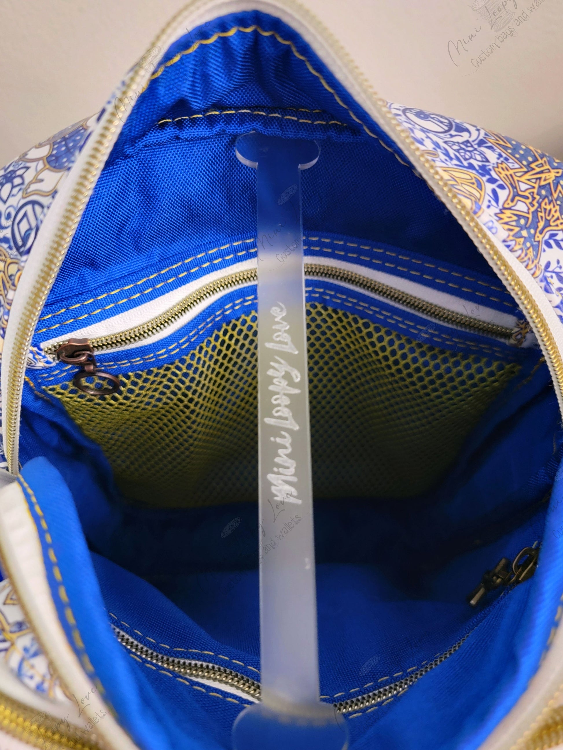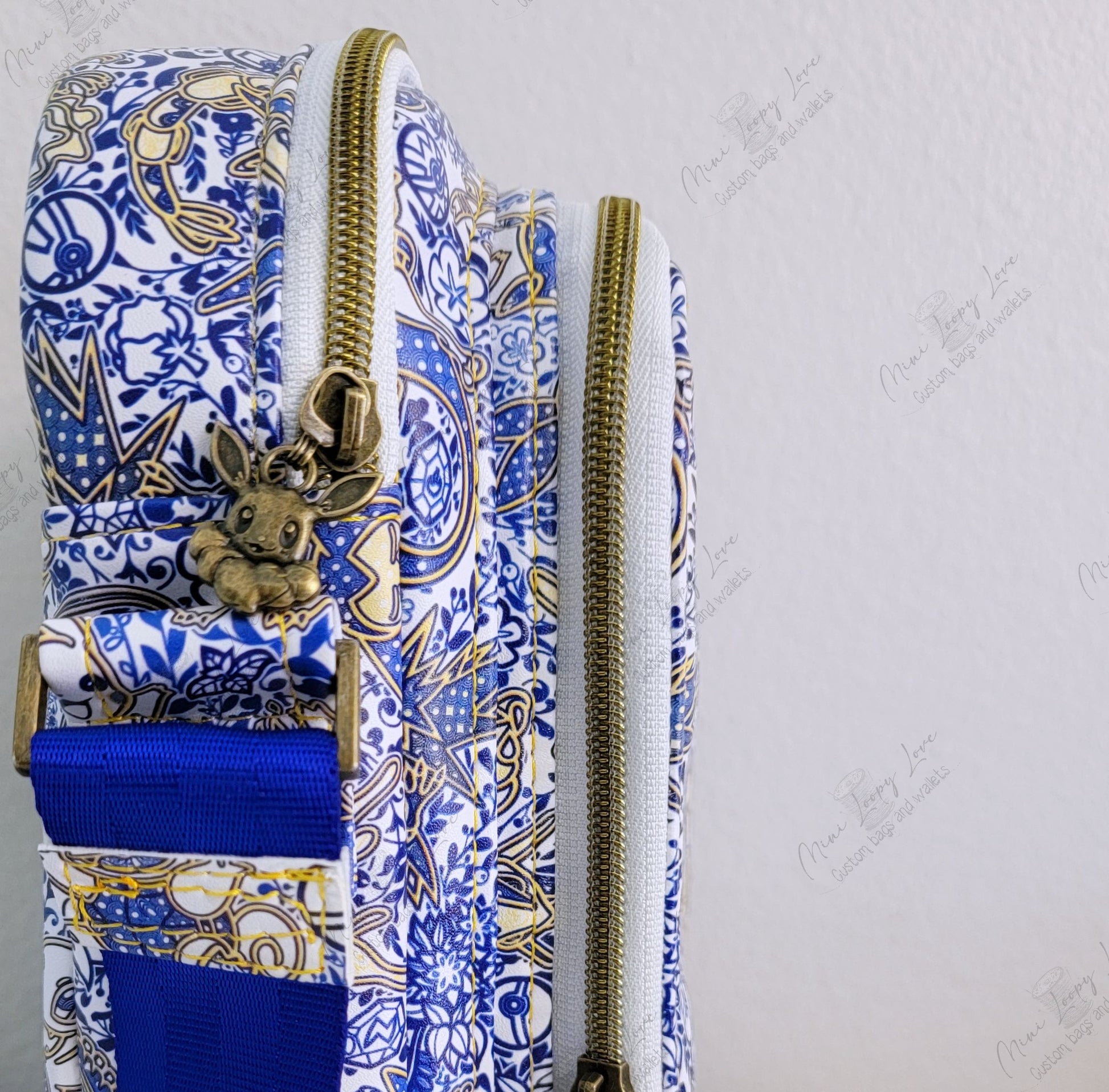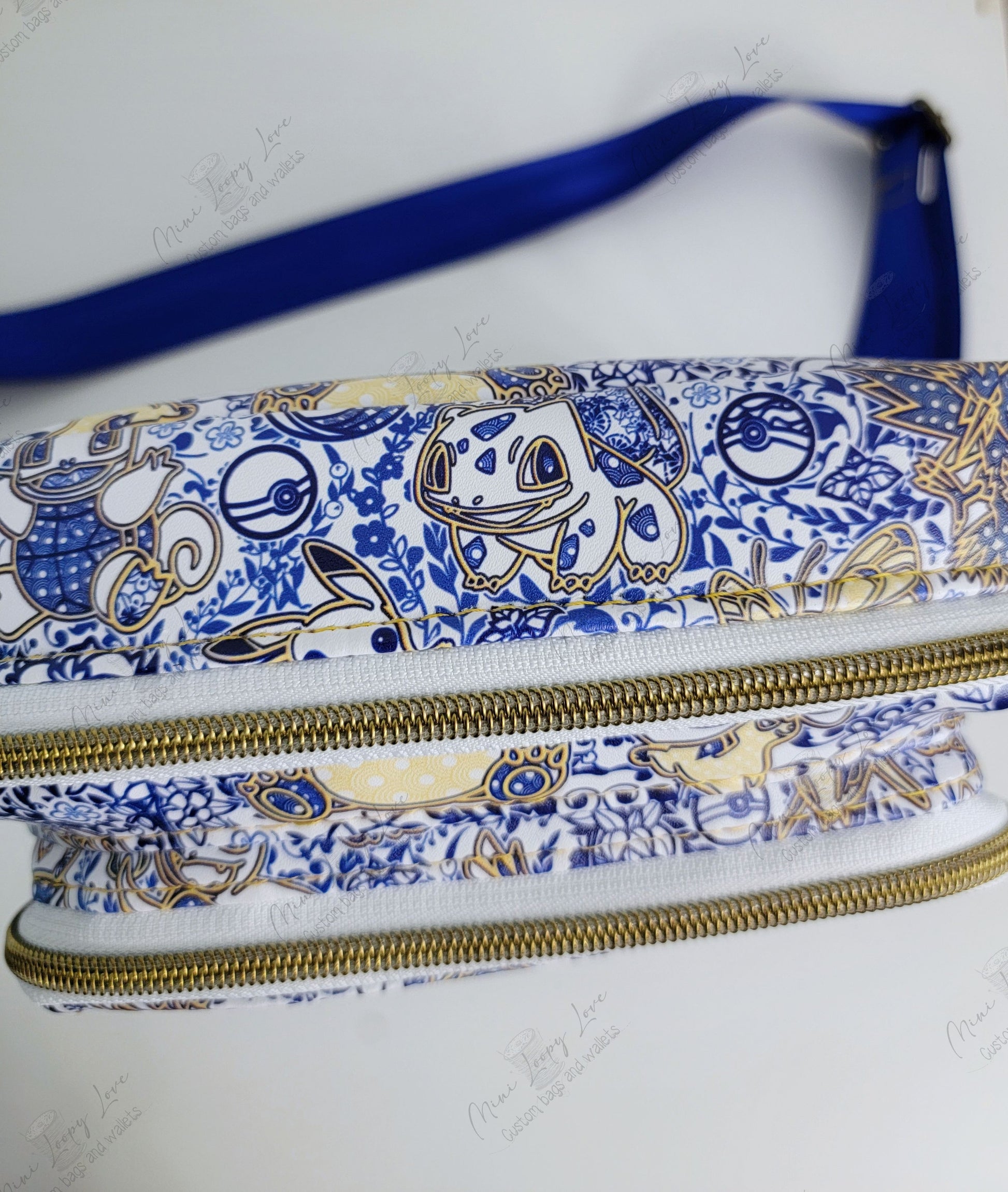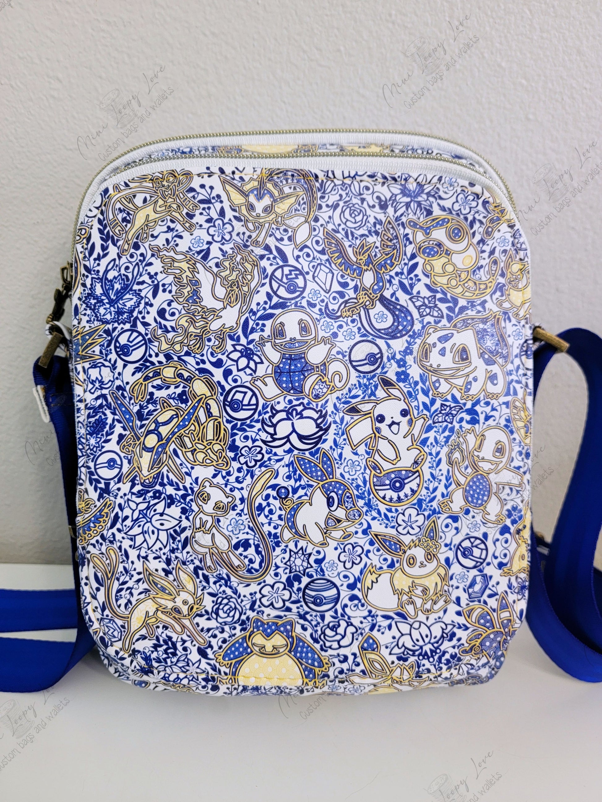 - 1.5" adjustable crossbody strap in blue seatbelt webbing for maximum comfort